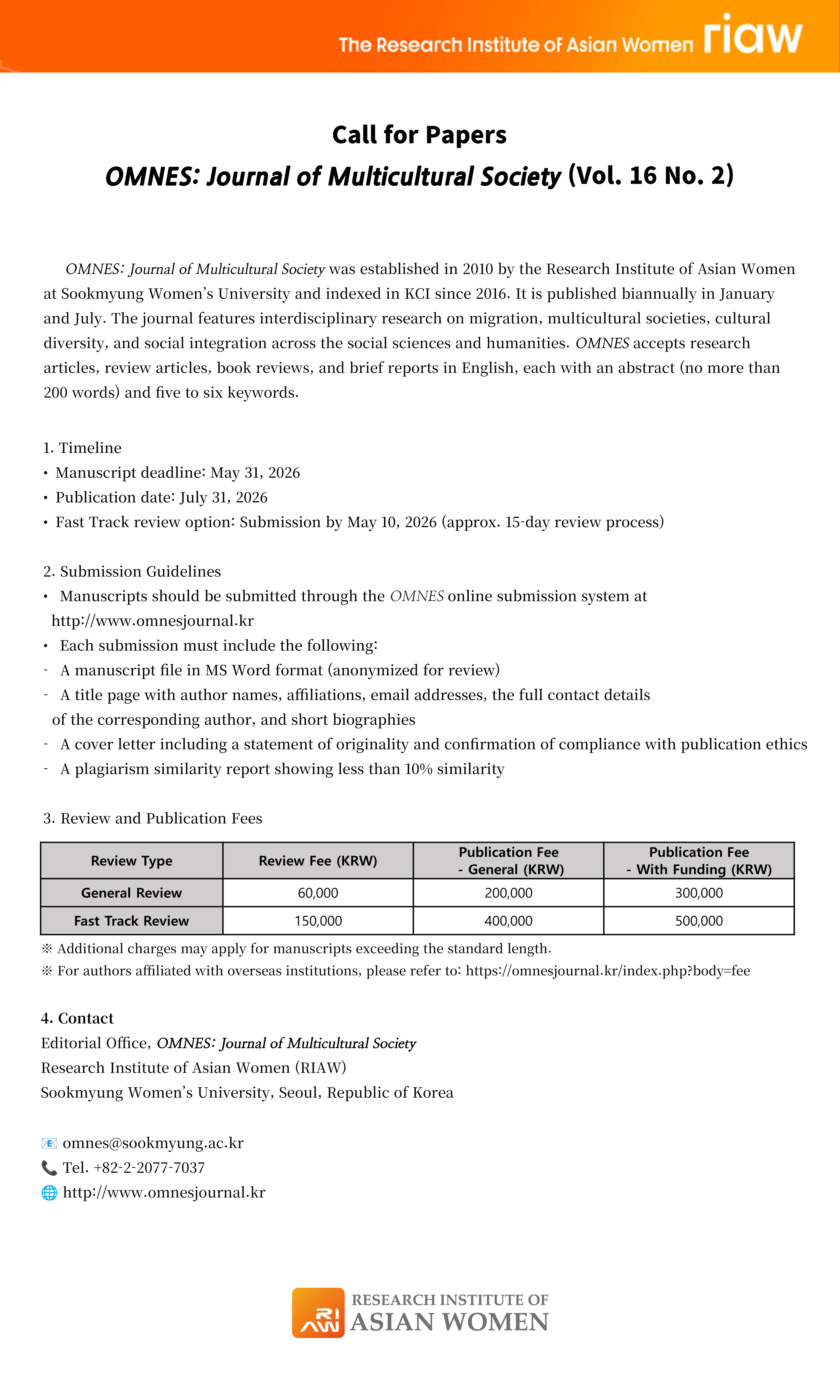 [KCI] OMNES: Journal of Multicultural Society Vol. 16 No. 2 - Call for Papers (~5/31)