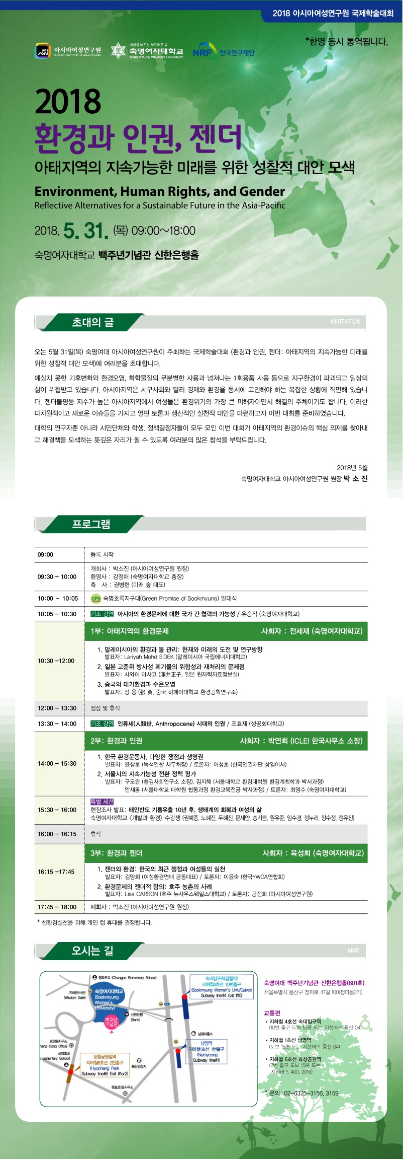 ''환경과 인권, 젠더: 아태지역의 지속가능한 미래를 위한 성찰적 대안 모색''이라는 주제로 2018년도 국제학술대회를 개최합니다.