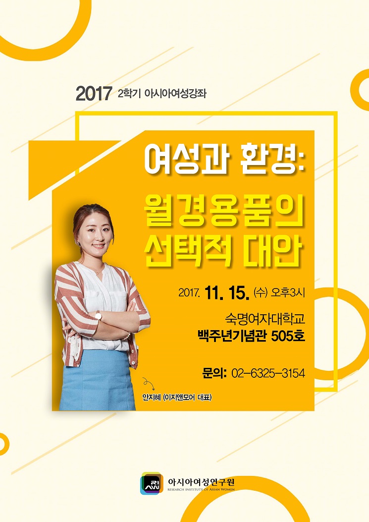 2017학년도 2학기 아시아여성강좌는 ''여성과 환경: 월경용품의 선택적 대안''이라는 주제로 개최됩니다.