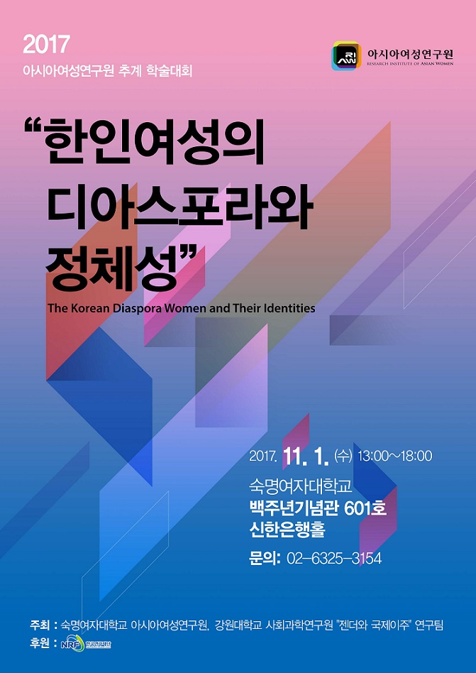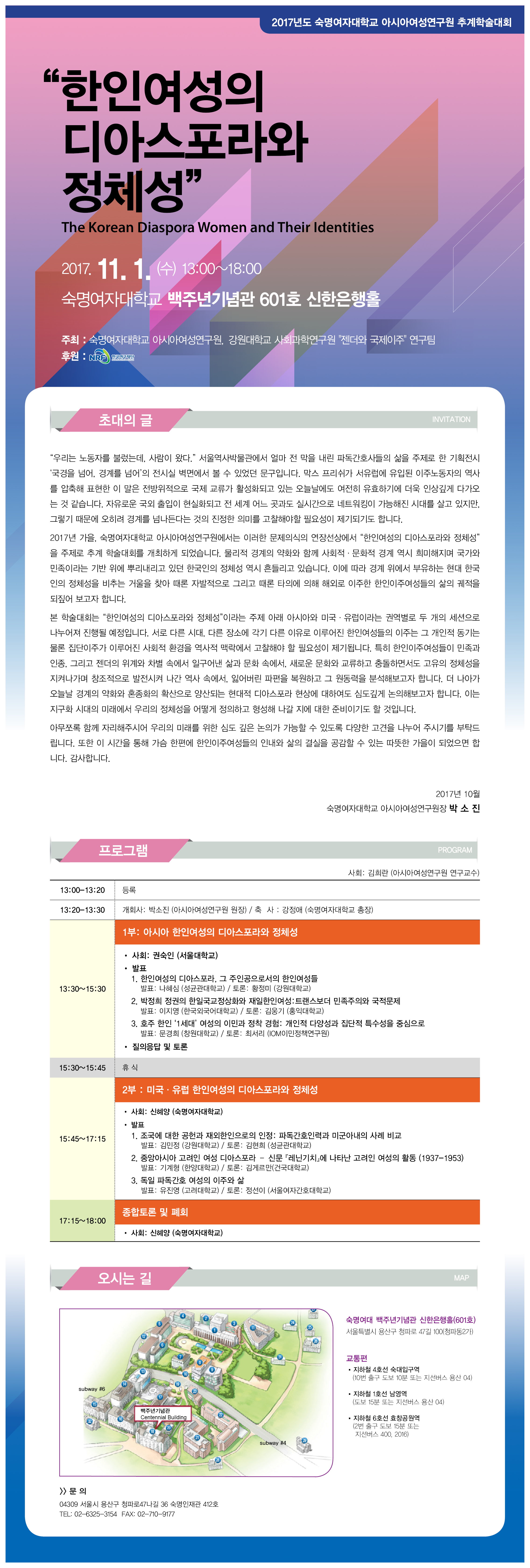 ''한인여성의 디아스포라와 정체성''이라는 주제로 2017년도 추계 학술대회를 개최합니다.