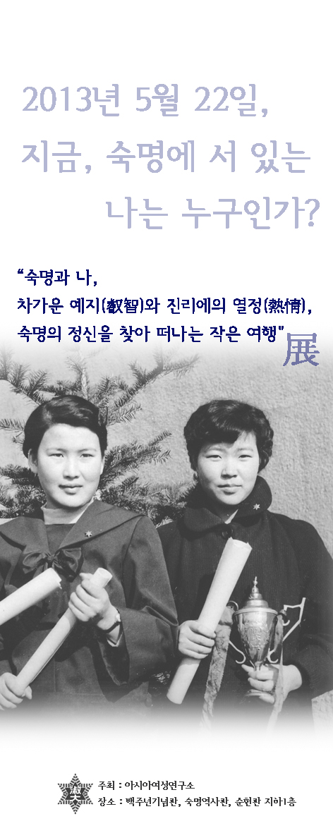 - 2013년 5월 숙명 창학주간에 맞추어 근현대를 잇는 총체적 시각에서 숙명의 역사를 100주년기념관 1층 숙명 역사관 로비에서 전시할 예정. 구체적으로 전시는 숙명역사관(제1전시관)을 출발로 역사관 로비에 새로 제2전시관을 만들고 3파티션으로 하여 위에 제시한 사진들을 3단계화하여 전시될 예정, 이후 도서관 1, 2층 및 순헌관 지하1층 로비에 사진전 투어가 방학기간 동안 이루어질 예정