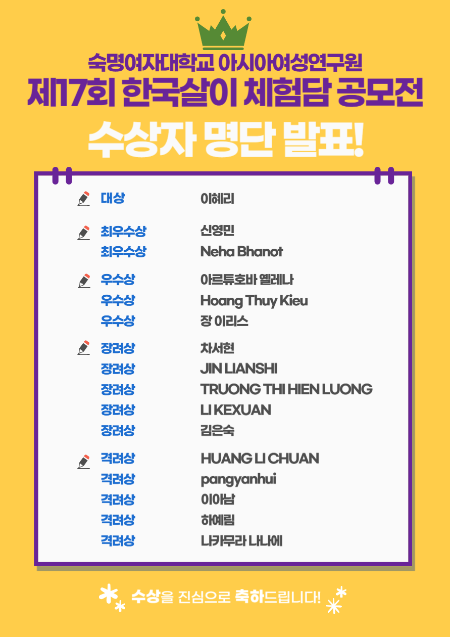 - 2024년 12월 18일(수) 3시~5시 숙명여자대학교 백주년기념관에서 시상식이 진행됩니다.