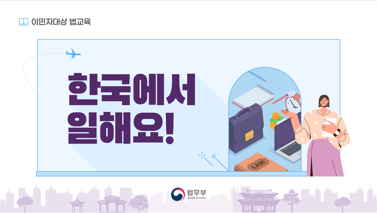 ○ 내용: 근로계약, 고용허가제, 근로시간과 휴식, 임금 체불, 산업재해보상보험, 도움 받을 수 있는 기관