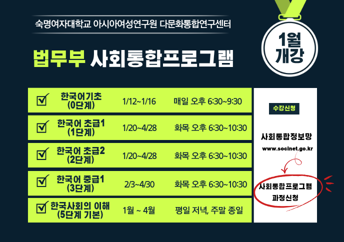 숙명여자대학교 아시아여성연구원 다문화통합연구센터에서는 2026년 1학기 법무부 사회통합프로그램 정규과정을 다음과 같이 실시합니다. 관심있는 분들의 많은 참여를 부탁드립니다.