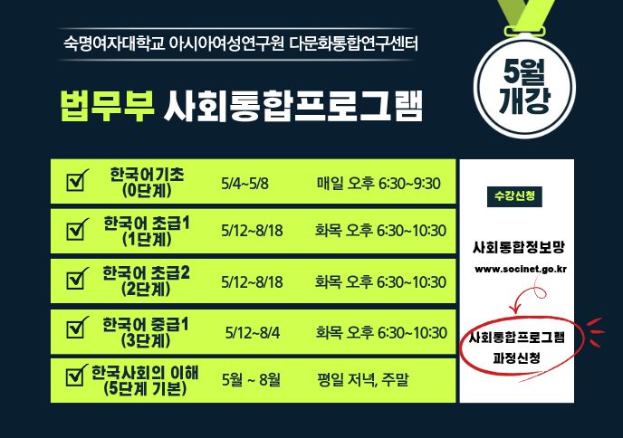 숙명여자대학교 아시아여성연구원 다문화통합연구센터에서는 2026년 2학기 법무부 사회통합프로그램 정규과정을 다음과 같이 실시합니다. 관심있는 분들의 많은 참여를 바랍니다.